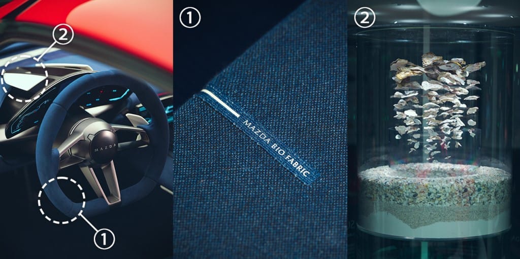 ชิ้นส่วนนี้ (ส่วนสีขาว) ทำจากเปลือกหอยนางรมที่ถูกทิ้ง สร้างขึ้นโดยร่วมมือกับบริษัทท้องถิ่นแห่งหนึ่งในเมืองฮิโรชิมา กลายเป็นประเด็นร้อนเนื่องจากเป็นจุดเด่นของ Mazda Iconic SP ซึ่งมุ่งสู่อนาคตที่ยั่งยืน