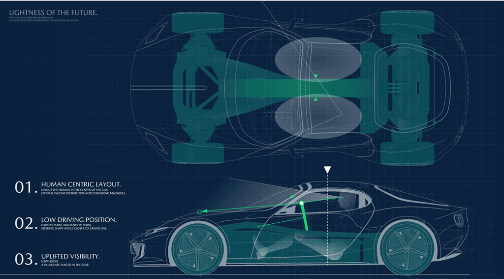 “ในระหว่างกระบวนการพัฒนา เราได้ศึกษาอย่างละเอียดถี่ถ้วนทุกรายละเอียด ตั้งแต่ประตูและตำแหน่งของยาง, ความยาวของตัวถัง, ตำแหน่งที่นั่งผู้โดยสาร และทัศนวิสัย… ก่อนที่จะสรุปโครงร่างรถ สิ่งนี้แสดงให้เห็นถึงความปรารถนาอันแรงกล้าของเราที่จะสร้างรถยนต์ที่สะท้อนถึงความมุ่งมั่นของมาสด้าที่มีต่ออนาคต ซึ่งรวมถึงความยั่งยืนและบทบาทในอนาคตของเทคโนโลยีเครื่องยนต์โรตารี่”