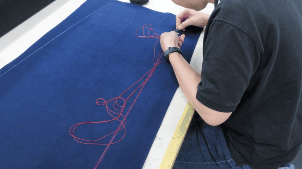 ซาโตะ: ส่วนเรื่องการเย็บ ผมอยากให้มันดูคล้ายงานปัก ผมเลยคิดหาวิธีต่างๆ ออกมา แล้วก็สร้างเอฟเฟกต์ 3มิติที่ทำได้ด้วยมือเท่านั้น