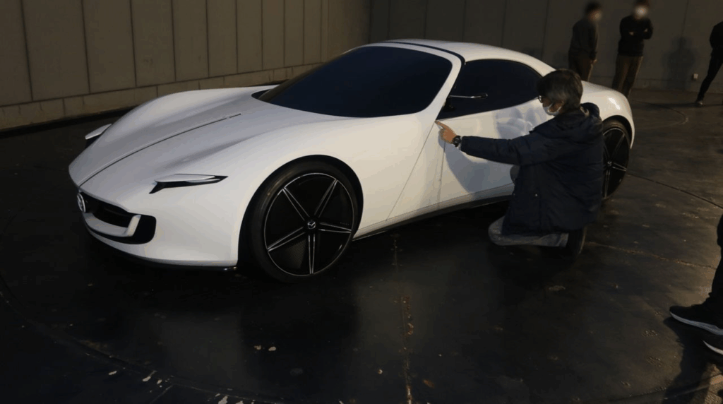ทาคาฮาชิ: เริ่มต้นด้วยการร่างภาพด้วยมือ โดยธีมคือ “รถสปอร์ต” หลังจากได้พูดคุยกับนากายามะซัง หัวหน้าฝ่ายเป็นเวลานาน เราได้ข้อสรุปว่ารถสปอร์ตคือรถที่ให้ความตื่นเต้นในการขับขี่ หยุดคิดเรื่องซับซ้อน แล้วกลับมาใช้ชีวิตแบบ “บริสุทธิ์” โฟกัสที่ความรู้สึก “ตื่นเต้นกับการขับขี่” คิดแบบนี้แล้วก็เริ่มสเก็ตช์ภาพ